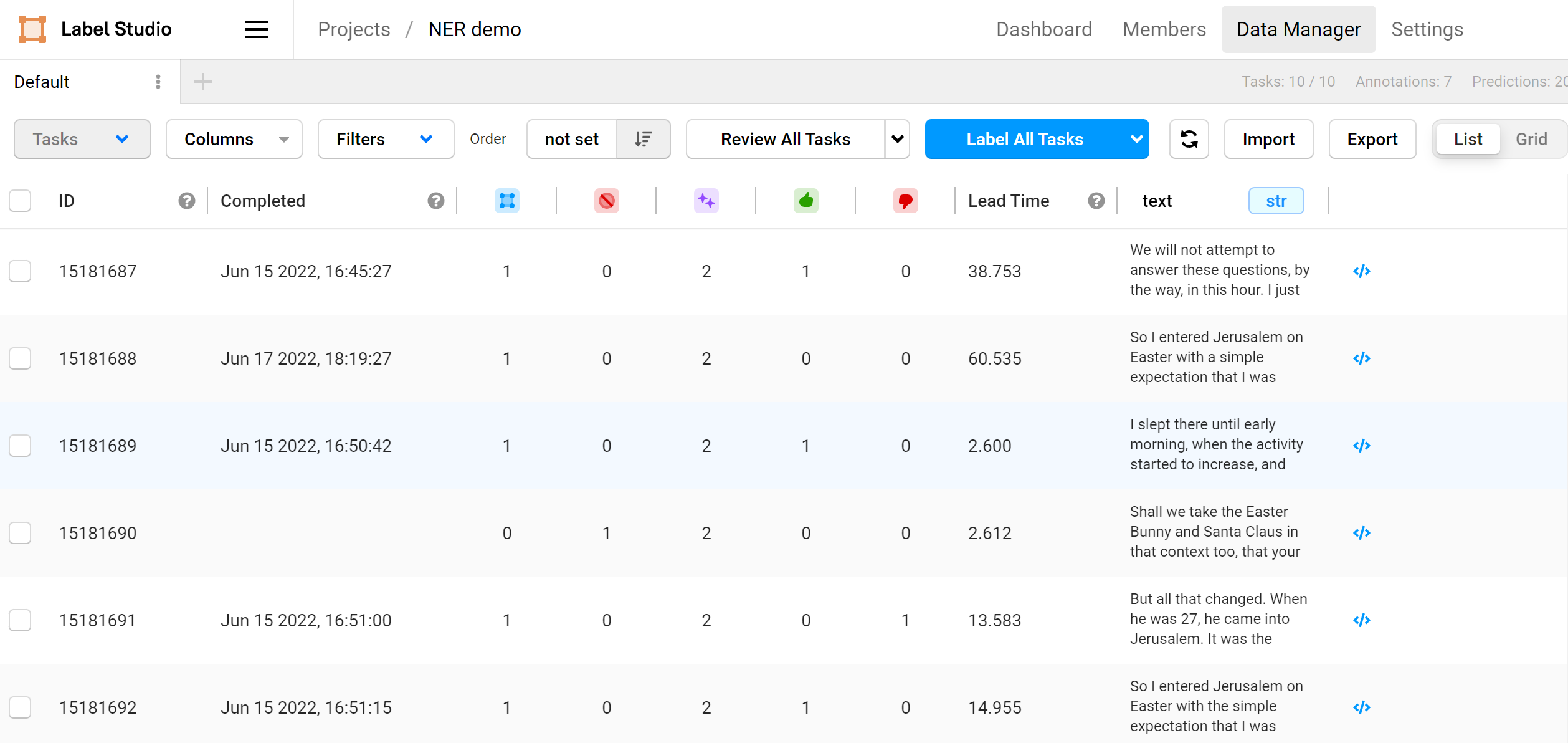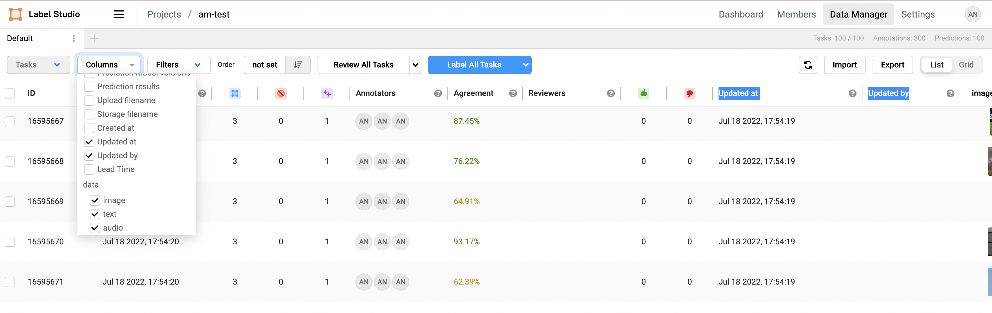 - This release includes the - Last updated bycolumn in Data Manager with information of- updated_at-- updated_by, annotator/reviewer (the person who made the last modifications for any of the annotations in this task) at- updated_attime.