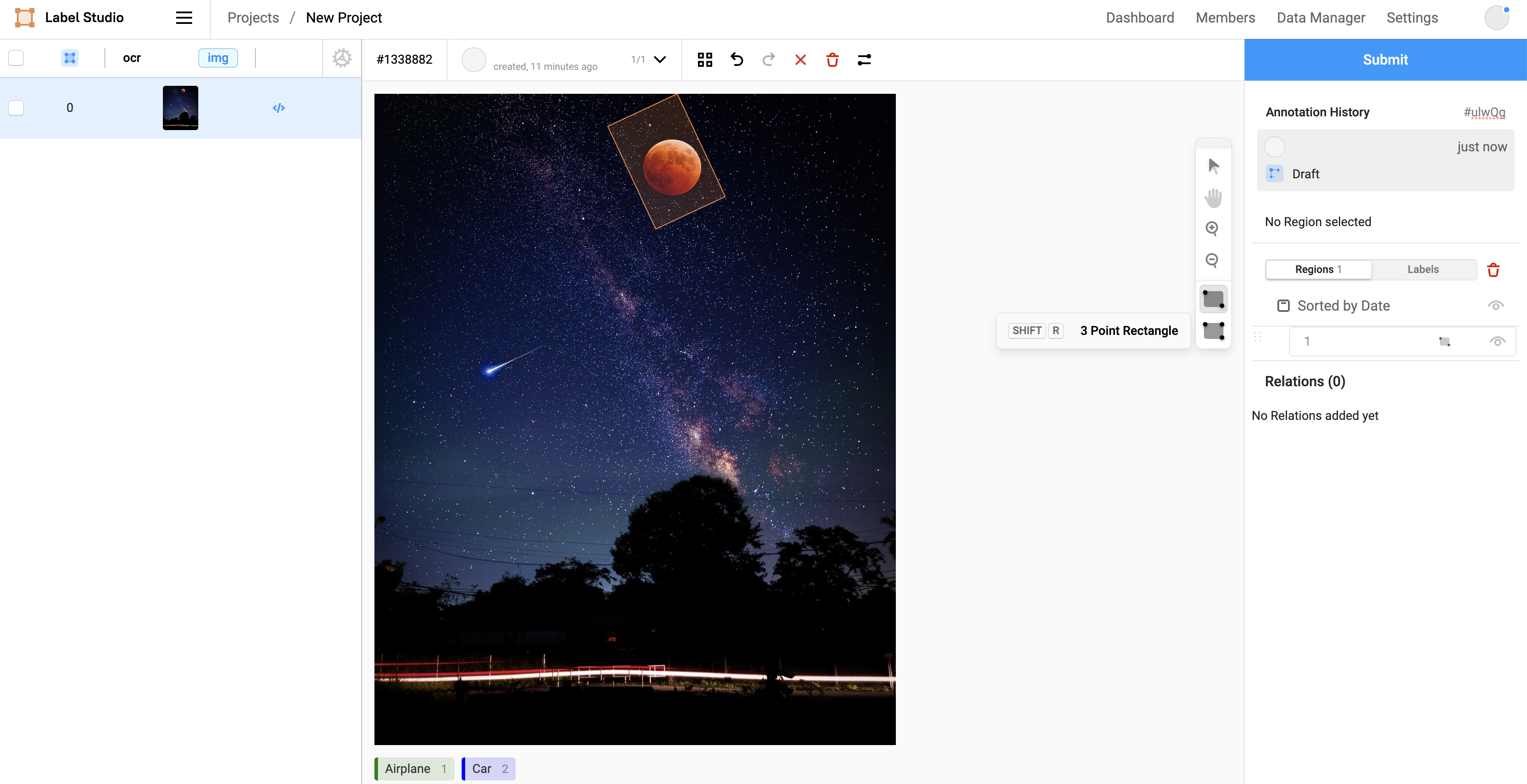 - Starting with this release, as an annotator you can create a rotated bounding box with the “three point click” or “two point click” feature to annotate images. - First point click - Starting point of the location to draw the bounding box.