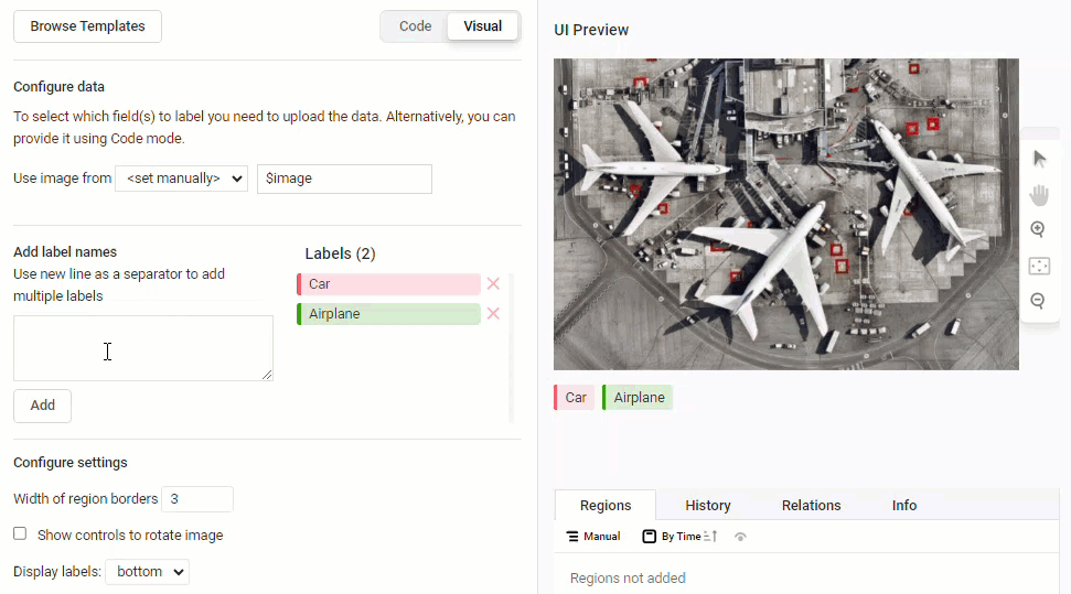 For more precise configuration, you can use the Code view. From here, you can view and edit the labeling configuration in an XML-like structure.