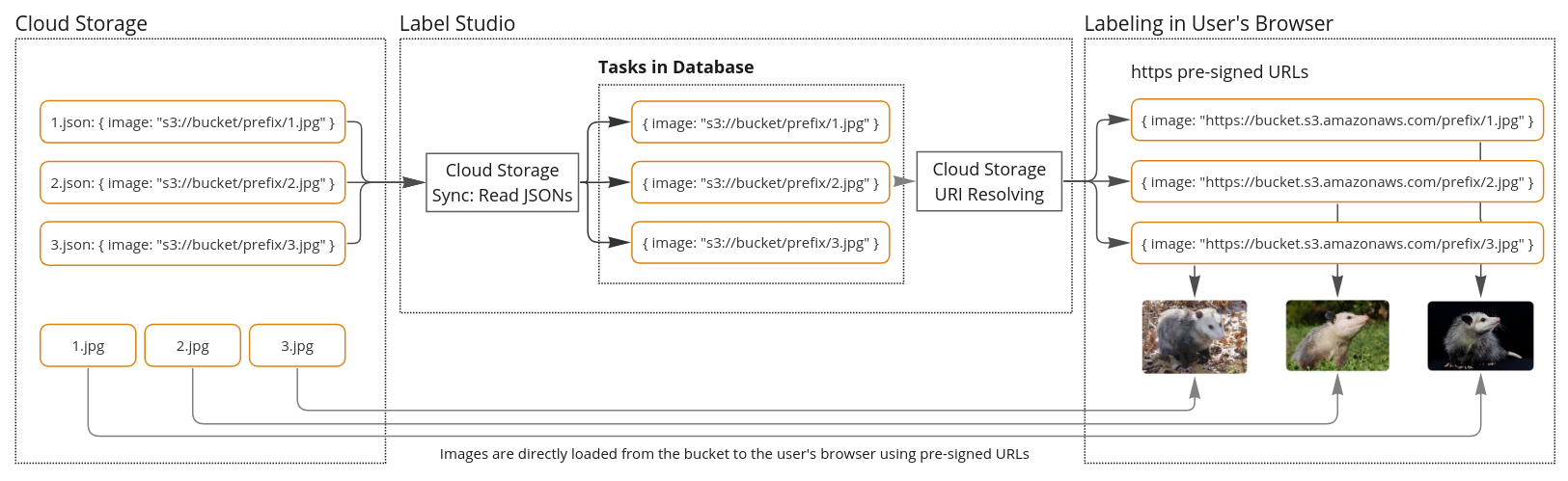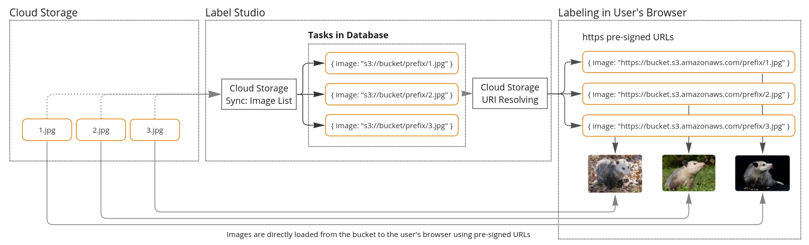 - URI resolving - when the Label Studio backend requests Cloud Storage to resolve URI links (e.g., s3://bucket/1.jpg) into HTTPS (https://aws.amazon.com/bucket/1.jpg). This way, user’s browsers are able to load media.